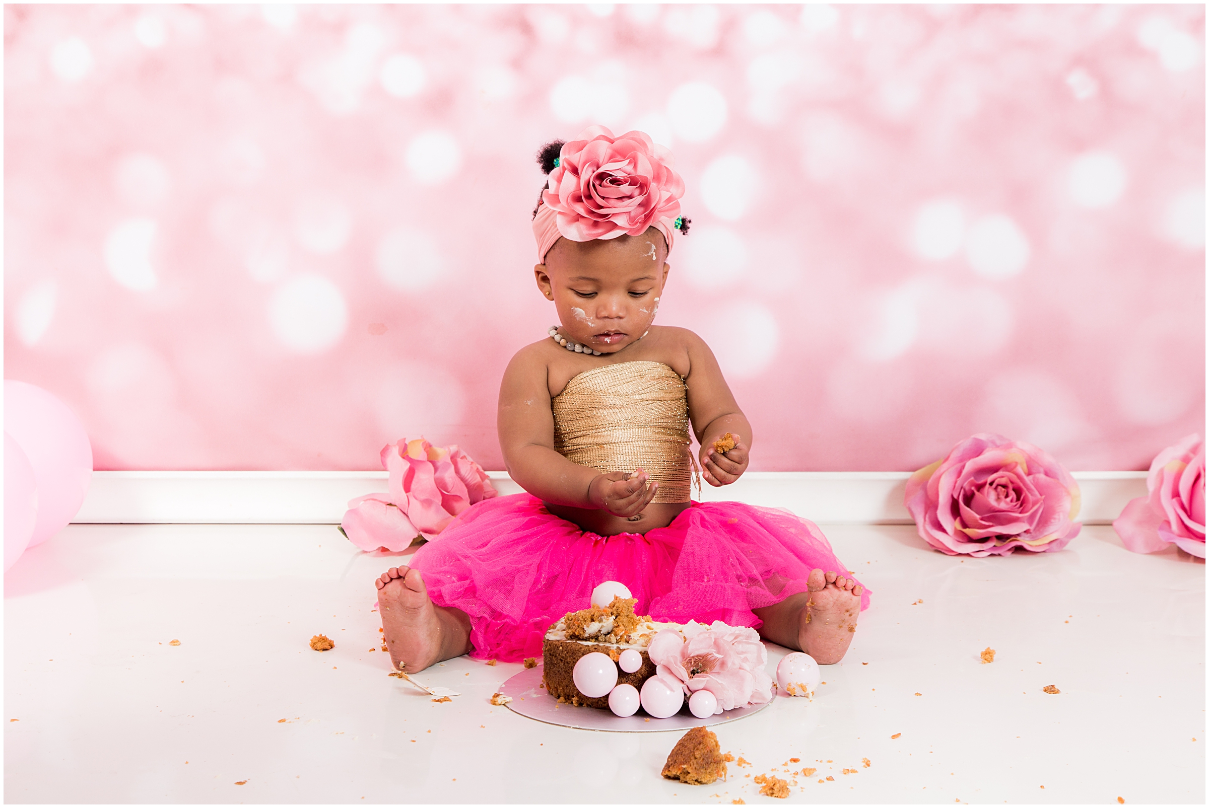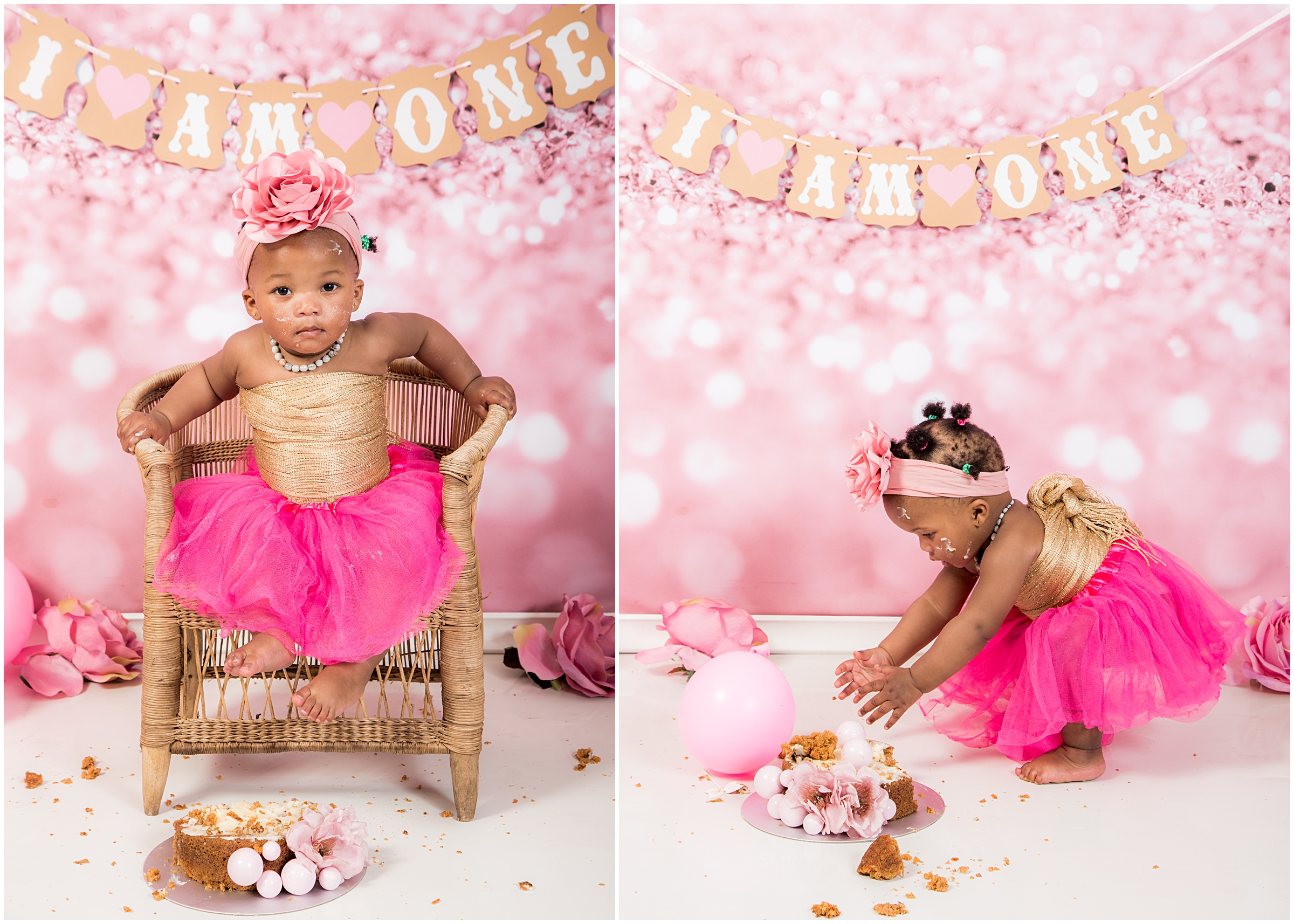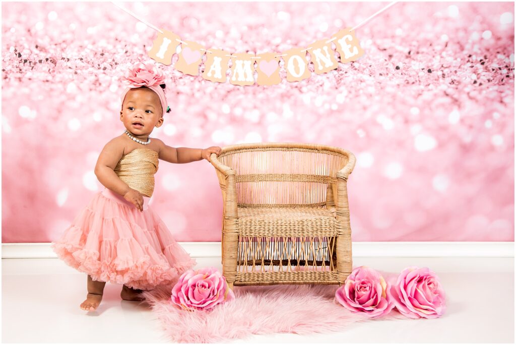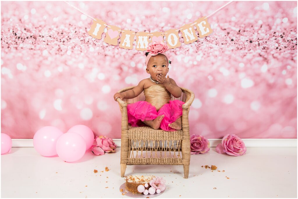 A memorable, glittery and shimmery pink themed cake smash was perfect one year old Iyazi, who has the most sparkling personality. Not to mention, the endless energy that she unleashed in my studio, adding an extra dose of cuteness. She looked so darling in her oversized flower headband. Nothing brings joy quite like cake and smiles. “May you shine wherever you go Iyazi!”