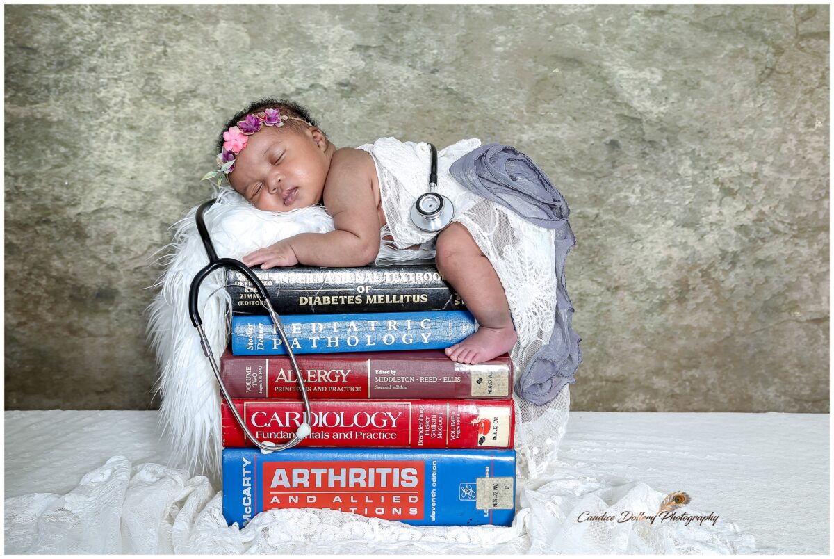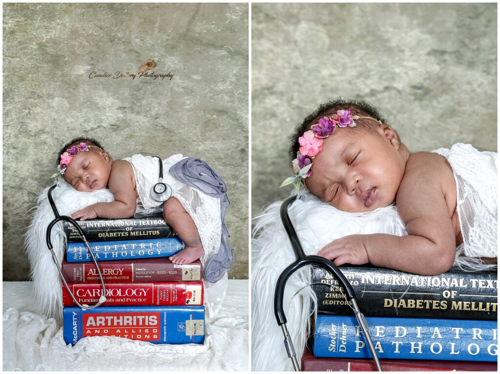 Doctor Mandy’s newborn session was bespoke and unique. Her darling baby girl could grow up to be a doctor just like her. Mandy’s university text books created the perfect prop for her little sleeping angel to pose on, complimented with a stethoscope draped over her little back. We finished off the session in hues of peaches. Just look at her sweet smile and pout at the end.