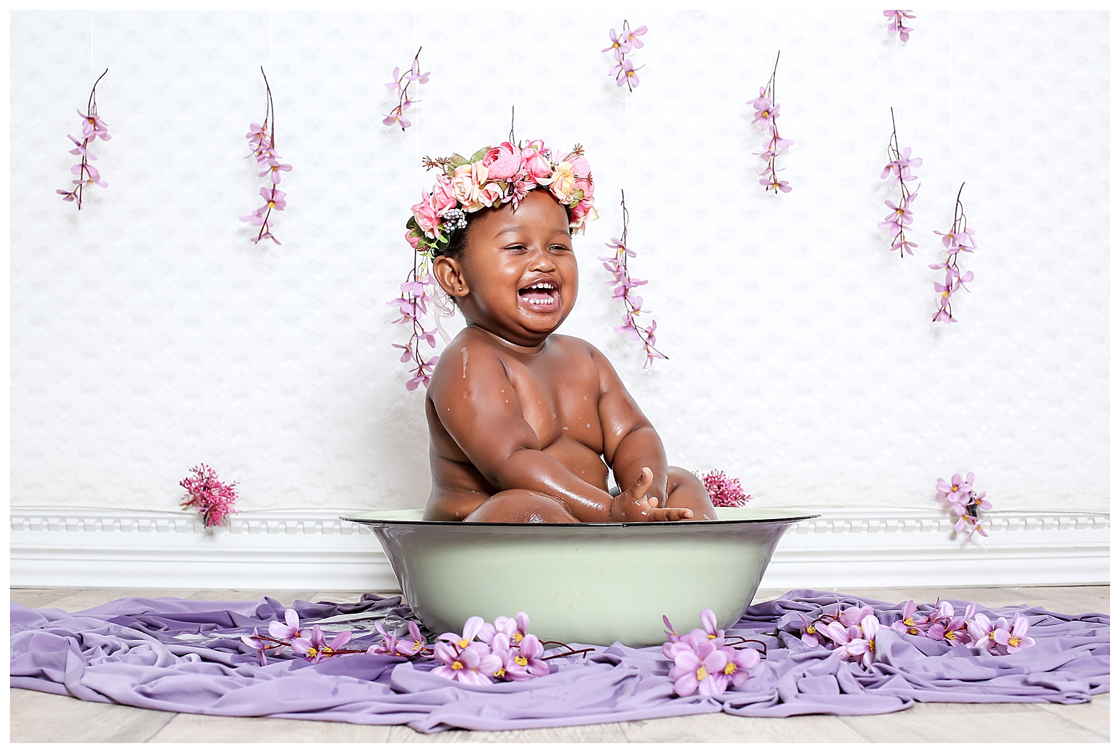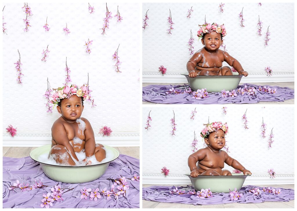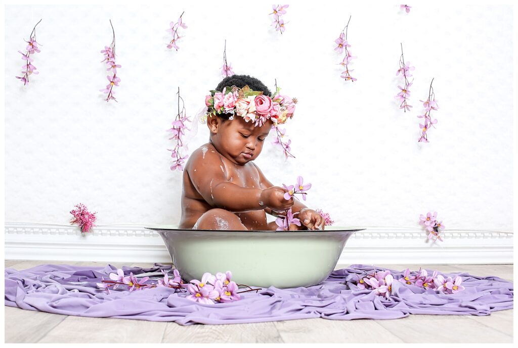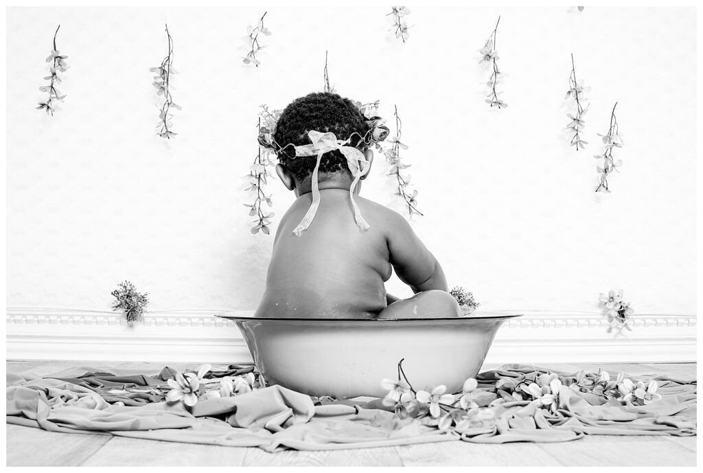 A flower bath is a wonderful way to capture your baby’s giggles and expressions. I have yet to encounter a baby who doesn’t enjoy splashing in warm water, whether is bath time or just playing in a simple tub filled with flowers and bubbles. This little darling splashed to her heart’s content.