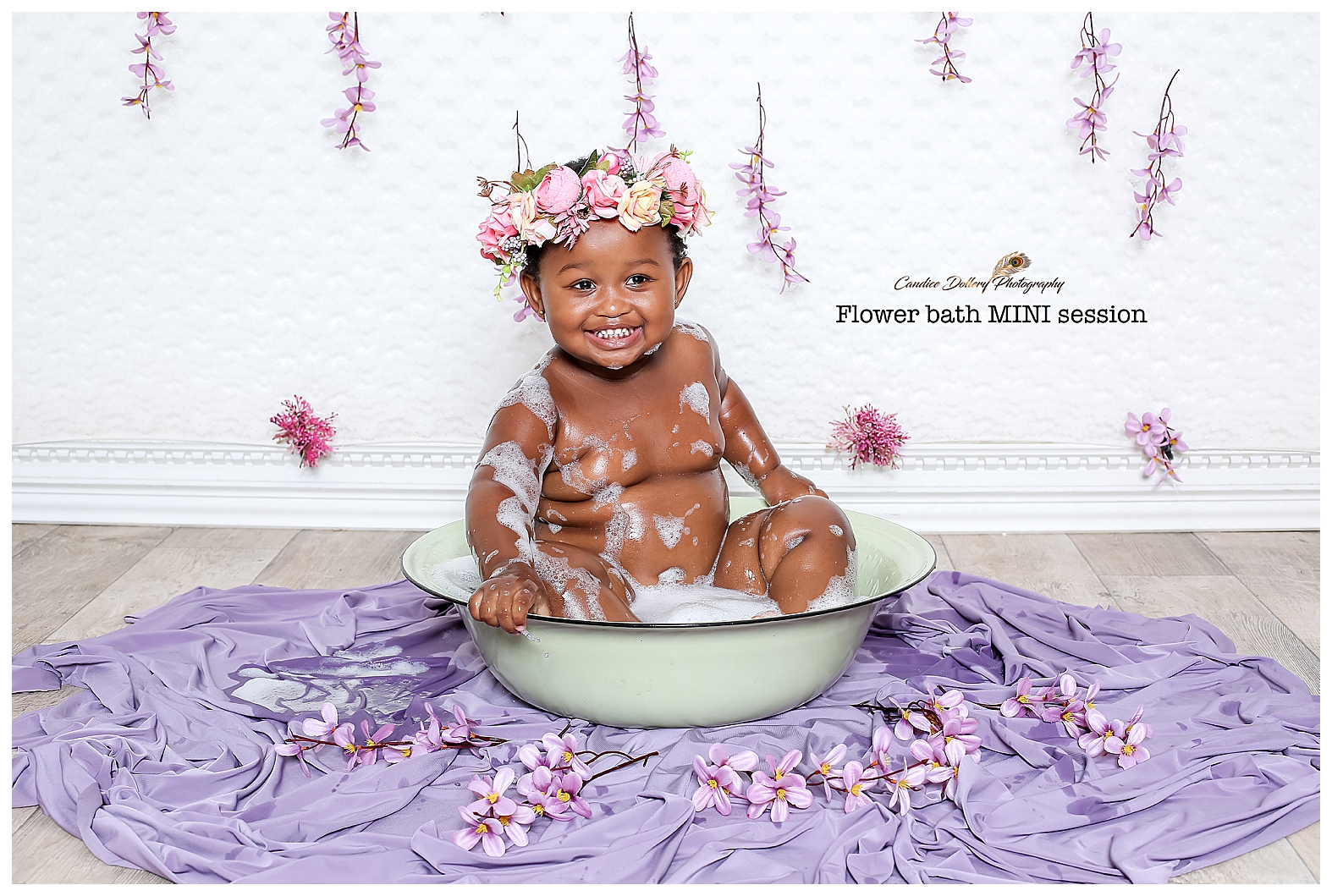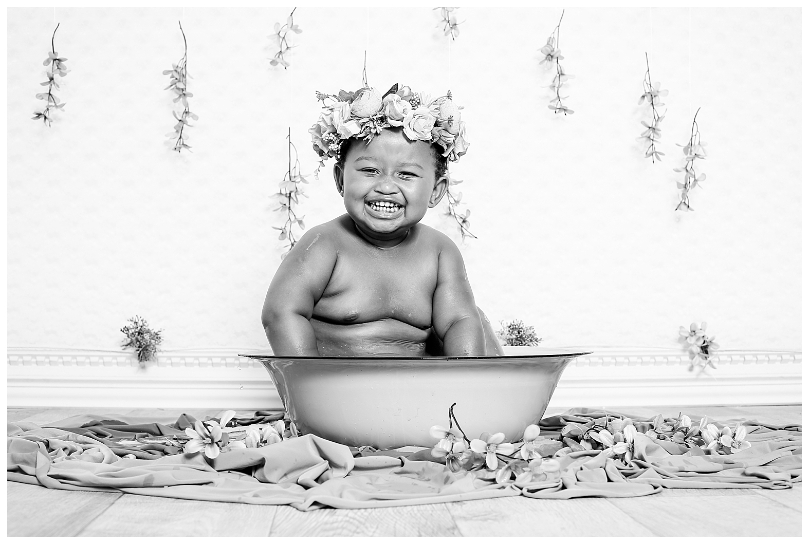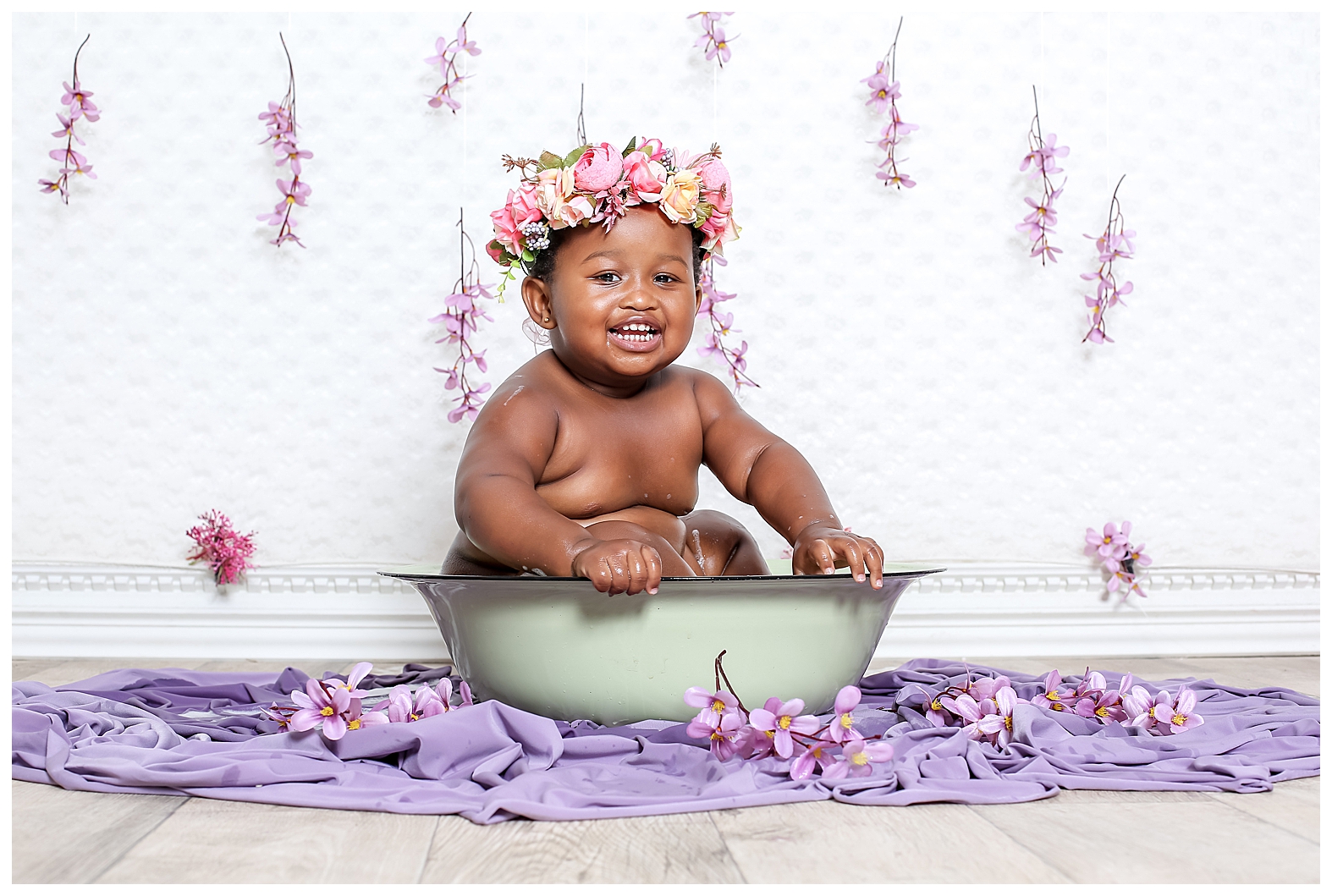 A flower bath is a wonderful way to capture your baby’s giggles and expressions. I have yet to encounter a baby who doesn’t enjoy splashing in warm water, whether is bath time or just playing in a simple tub filled with flowers and bubbles. This little darling splashed to her heart’s content.