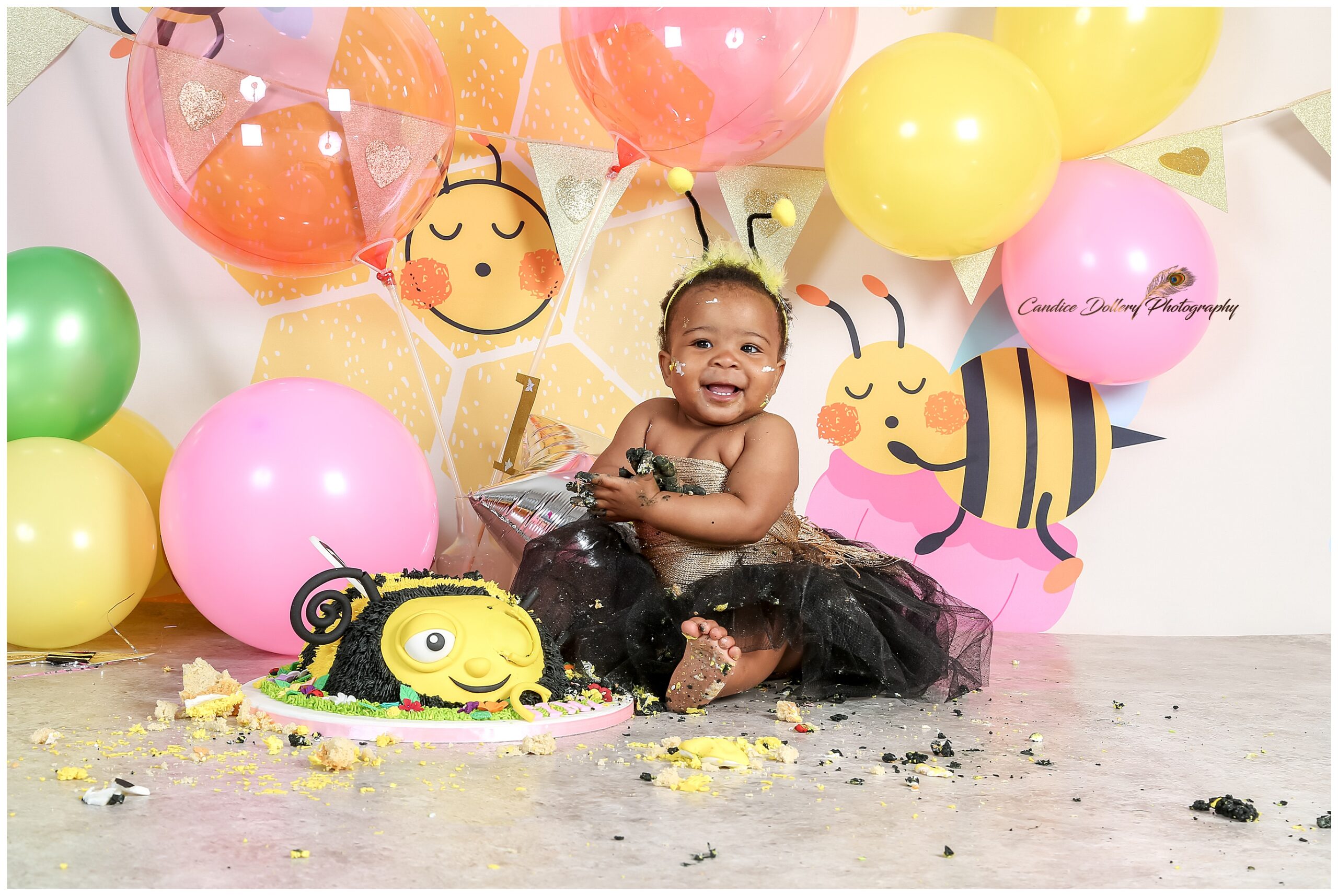 September 22, 2024 Candice Dollery bee themed cake smash, cake smash photography, East London cake smash photographer, East London Studio photographer, kids birthday photography East London, milestone photoshoot, smash cake photoshoot 1st Cake Smash