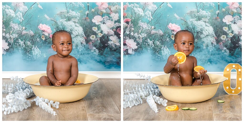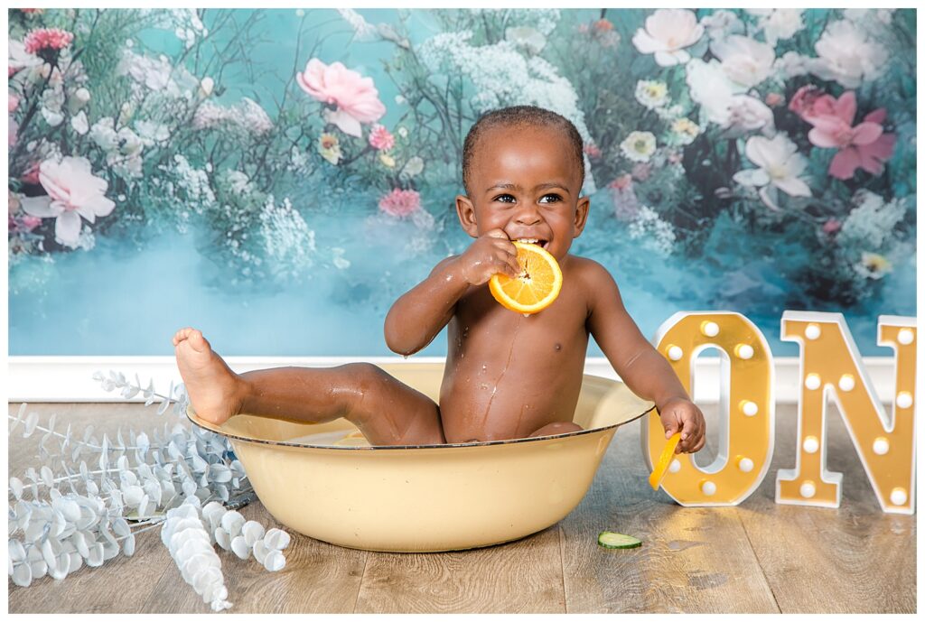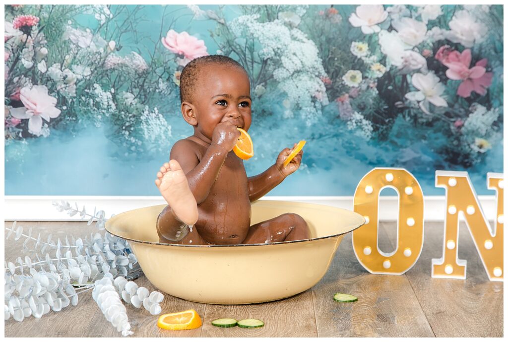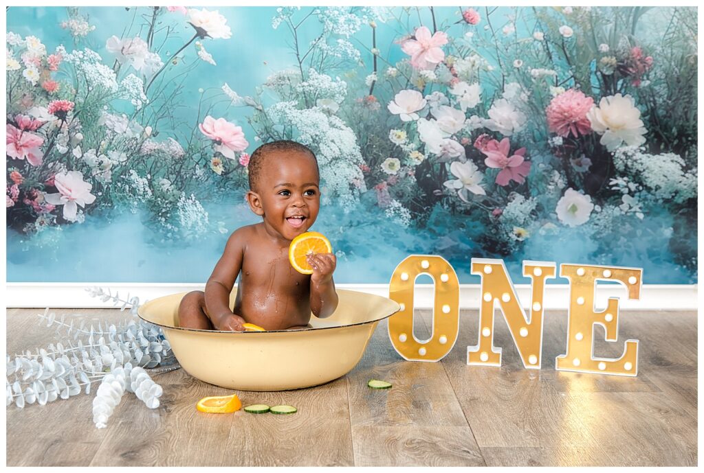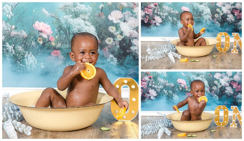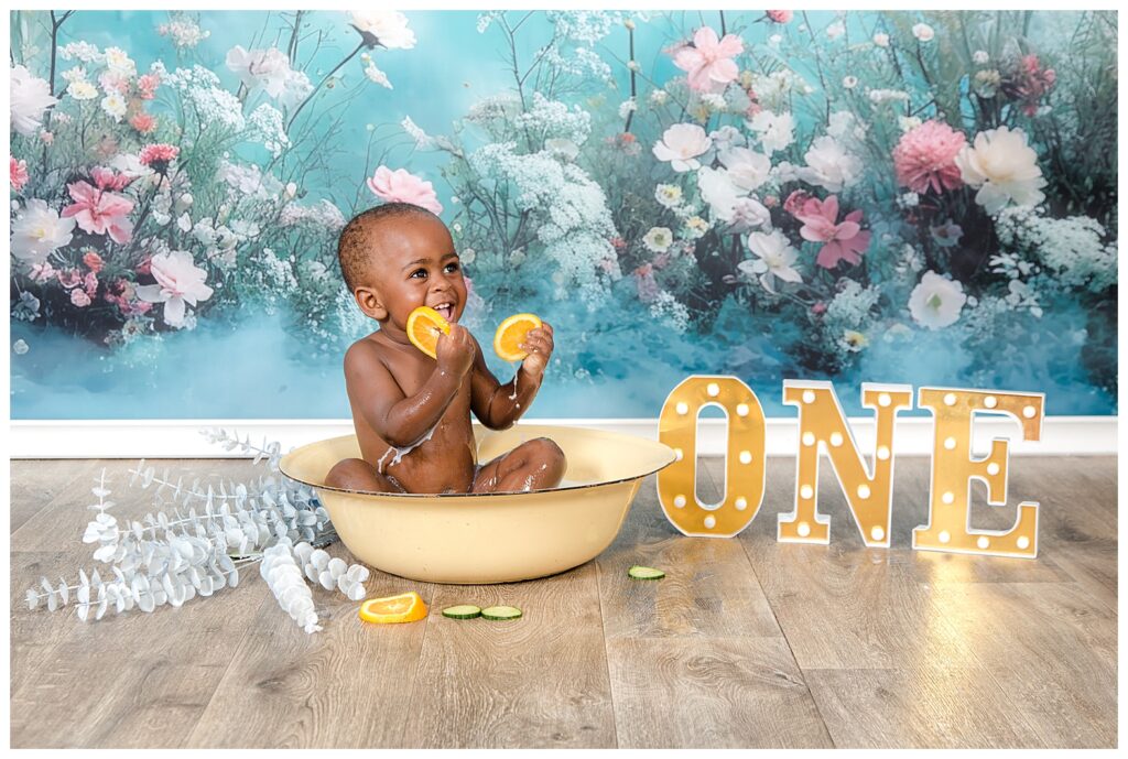 April 18, 2025 Candice Dollery fruit bath photo session, fruit bath photographer, milestone photoshoot, milk bath first birthday, Studio photographer Candice Dollery East London, studio photographer East London Milk, Fruit & Flower Baths
